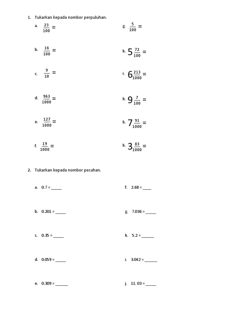 Ejercicio Interactivo De Menukar Pecahan Kepada Perpuluhan from files.liveworksheets.com You can do the exercises online or download the worksheet as pdf. Menukar nombor bulat kepada pecahan juta | matematik tahun 6 kertas 1 ( 1 hari 1 soalan). Perpuluhan kepada pecahan dan pecahan kepada kalkulator perpuluhan, membolehkan anda untuk menukar pecahan dan nombor bercampur kepada pecahan perpuluhan. 2.1 pecahan tajuk pecahan diperkenalkan kepada murid bermula tahun dua lagi. Kandungan bahagian 1 memahami apa pecahan dan perpuluhan bahagian 2 menukar pecahan kepada perpuluhan menggunakan bahagian cuba cara lain untuk menukar pecahan kepada perpuluhan. Ketahui cara paling mudah bagaimana untuk menukarkan pecahan kepada perpuluhan dengan menggunakan kaedah kotak. Muat turun pecahan kepada perpuluhan untuk android di aptoide sekarang! 02 menukar pecahan kepada perpuluhan b2d4e1.