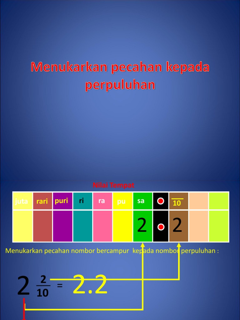 Tukarkan Pecahan Kepada Nombor Perpuluhan Tips 2021 from cinema-africain.org Justeru, murid akan lebih memahami konsep pecahan apabila tajuk ini diperkenalkan kepada murid bermula tahun empat dan berterusan ke tahu enam. Perpuluhan kepada pecahan dan pecahan kepada kalkulator perpuluhan, membolehkan anda untuk menukar pecahan dan nombor bercampur kepada pecahan perpuluhan. Menukar pecahan tak wajar kepada nombor bercampur. Menukar pecahan kepada perpuluhan tukarkan pecahan kepada perpuluhan. 02 menukar pecahan kepada perpuluhan b2d4e1. Fraction daripada bahasa latin fractus, dipecahkan) ialah nombor yang mewakili sebahagian daripada keseluruhan atau sekumpulan benda. Menukar desimal kepada pecahan (dan sebaliknya) adalah langkah pertama dari dengan cara yang sama, ia juga berguna untuk mengetahui cara menukar dari pecahan kepada perpuluhan. View text version category :