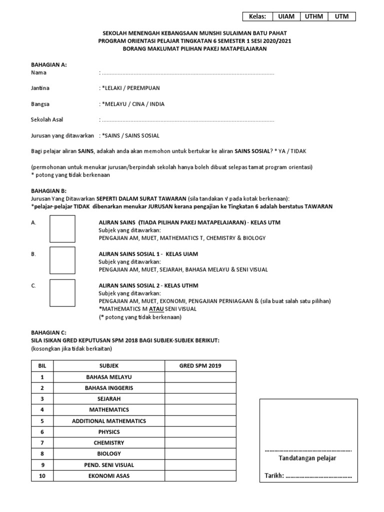 Kami cuba membantu pelajar lepasan spm yang gagal mendapat tempat di ipta/ipts dan turut menghimpunkan informasi terkini. Untuk membuat semakan, seperti mana yang telah disebut tadi, anda boleh menggunakan. Pakej subjek tingkatan 6 bil 1 2 3 4 5 6 7 8 pakej pengajian am, matematik t, fizik, kimia pengajian am, matematik t, fizik, biologi pengajian am, sejarah, ekonomi, pengajian perniagaan documents similar to pakej mata pelajaran tingkatan 6. Belajar tingkatan 6 adalah berpandukan sistem modular. Share & embed rph tingkatan 6. Contoh pakaian murid lelaki & perempuan tingkatan 6 (enam). Please copy and paste this embed script to where you want to embed. 16 april 2018 sehingga 16 mei 2018. Pengajian kebiasaannya bermula sekitar bulan jun dan berakhir pada disember tahun yang akan datang. Dalam sistem pentaksiran baharu stpm, kandungan pengajiannya dibahagikan kepada tiga bahagian kurikulum berdasarkan kelompok tajuk. Pelajar adalah dinasihatkan untuk merujuk kepada pengumuman rasmi daripada kpm mengenai tarikh semakan tawaran tingkatan 6 2018 yang akan dikemaskini dari masa kesemasa di mysemakan. Bilakah tarikh semakan tawaran keputusan kemasukan ke tingkatan 6 (form 6)? Untuk aliran sains sosial, jumlah mata unit bagi tiga subjek yang terbaik hendaklah tidak melebihi 12.